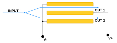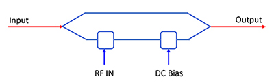 强度调制器使用马赫-曾德尔干涉仪(MZI)的结构,将波导分成两条路径并重新组合(下图)。电极被放置在两个波导路径周围,以在分裂时调制光中的相位。当路径重新组合时,光路根据相位经历构造或解构干涉,从而调制光强度。