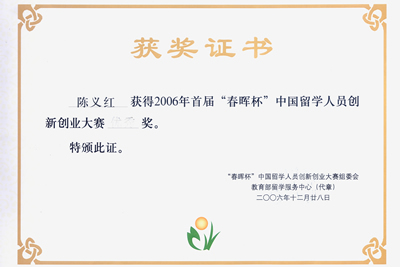 陈博士获“首届“春晖杯”中国留学人员创新创业大赛”优秀奖