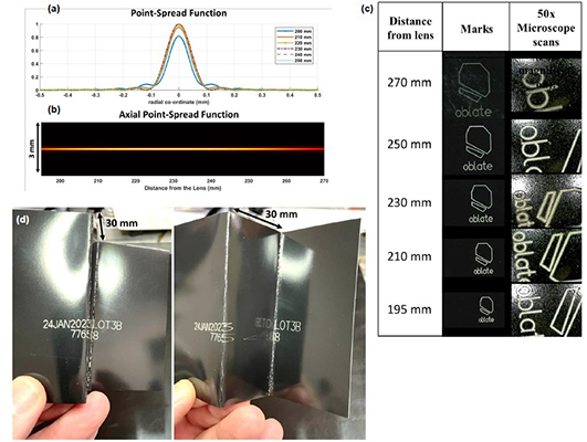 扩展景深(EDOF)平面透镜的性能如下图所示。在图 (a) 中,计算得出的点散射函数(PSF)显示了扩展景深范围内的良好聚焦效果。计算出的 Point-spread function (PSF) 与镜头距离的函数关系也显示在图(b)中。图 (c) 右侧显示了距离镜头 195 - 270 毫米的标准黑卡标记测试以及标记的显微镜放大(50倍放大率)。目标距离发生变化时没有进行重新对焦。虽然由于工作距离的原因,标记的大小有所变化,但光斑的大小保持一致。在图(d)最下方的照片中,在一张折叠的卡片上进行了标准黑卡标记测试,卡片的两个表面相距 30 毫米。两个表面上的标记都清晰明确。