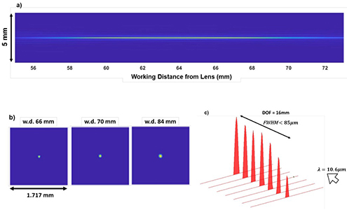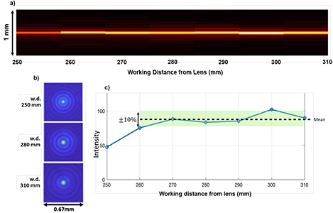 c) 轴上光斑的峰值强度。沿工作距离的变化为+/-10%