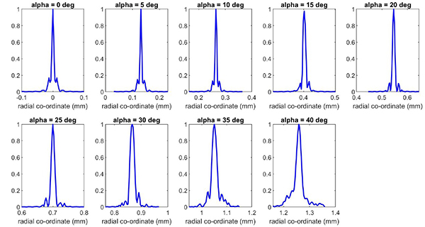 b) 点扩散函数在距透镜三个距离处的实验数据