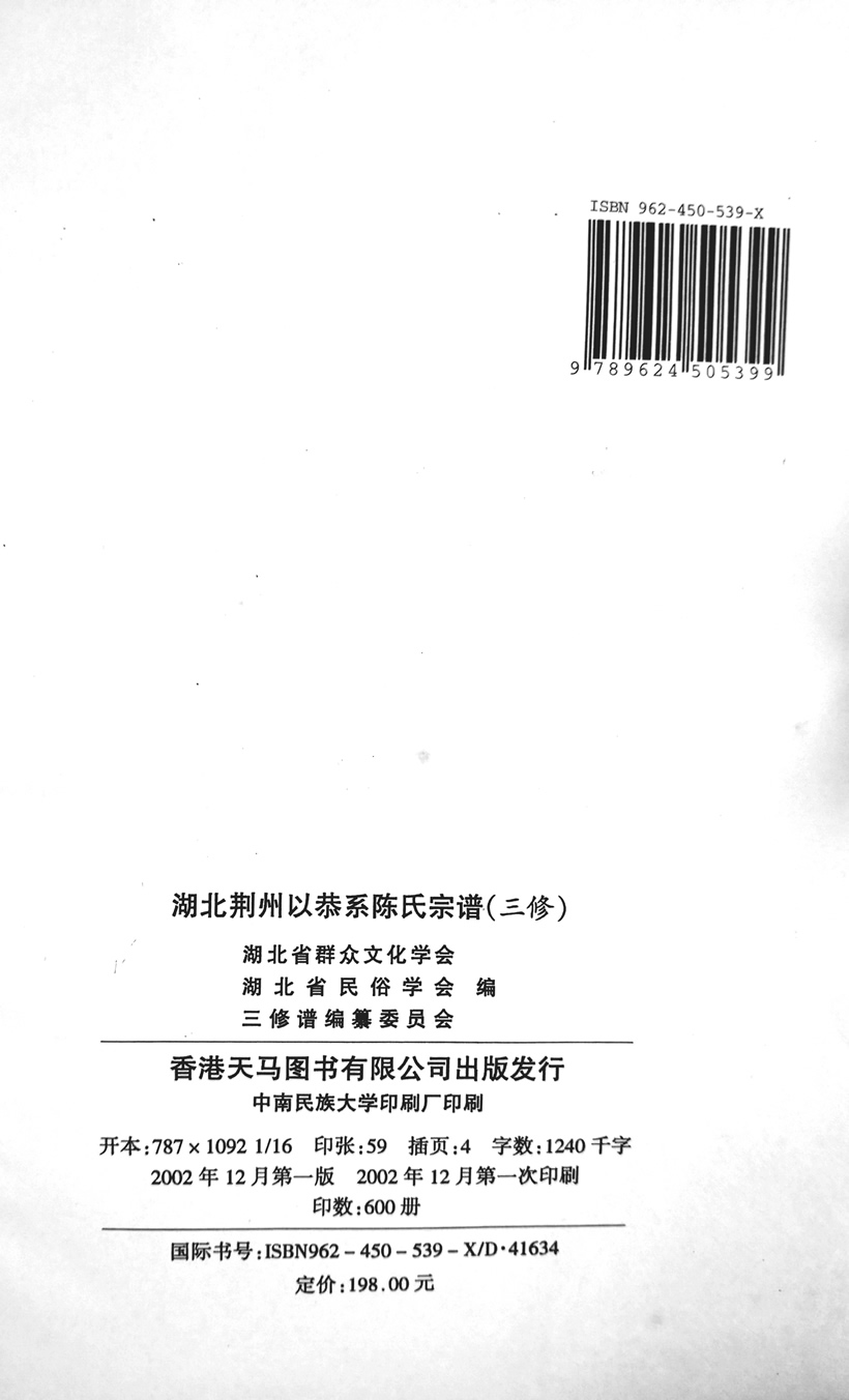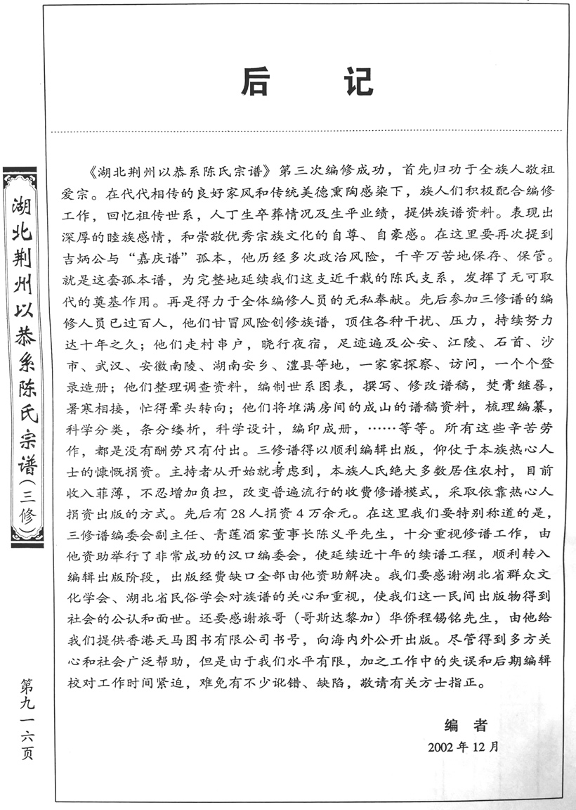 【三修谱】内封面、捐资榜、后记、出版书号 作者:超级管理员 来源:本站 发布日期:2018-01-27 关注:592 上一篇:【三修谱】文汇、会议纪要、倡议书(899-903页) 下一篇:【三修谱】艺文、康熙皇帝圣诏、寿文、赞文(126-143页)
