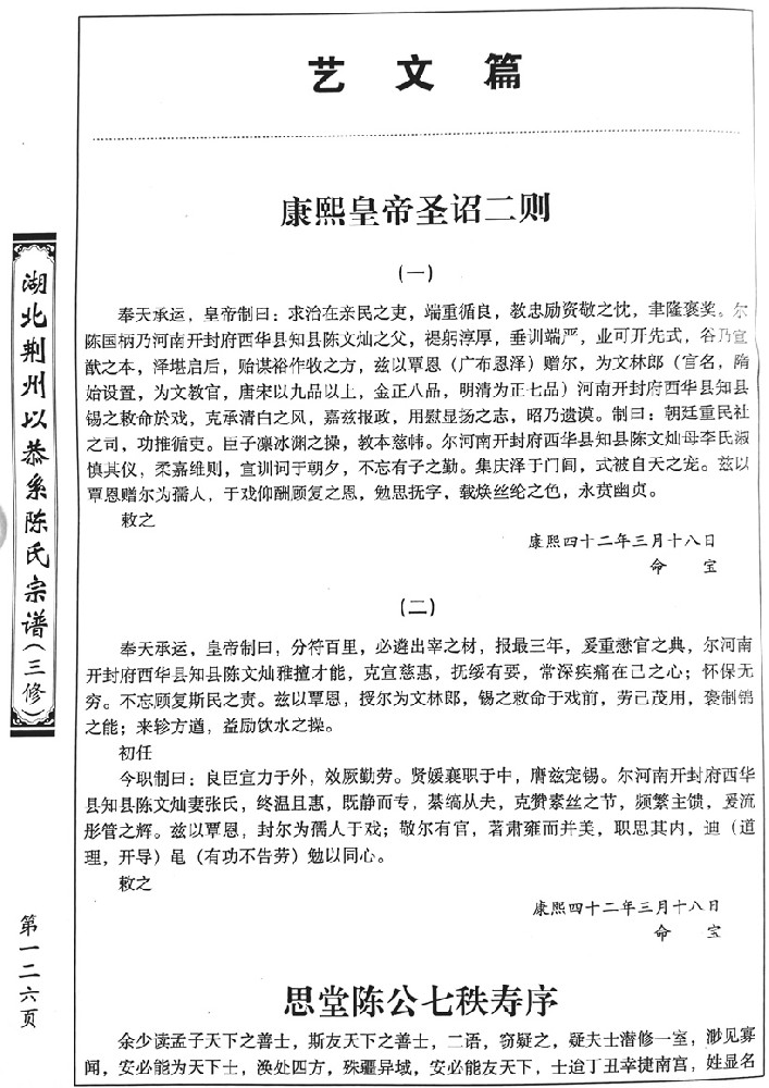 【三修谱】艺文、康熙皇帝圣诏、寿文、赞文(126-143页) 作者:超级管理员 来源:本站 发布日期:2018-01-27 关注:560 上一篇:【三修谱】内封面、捐资榜、后记、出版书号 下一篇:【三修谱】诗词选(143-147页)