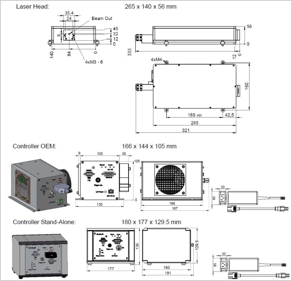 选项 | 手动快门或电子光闸, 外部扩束(例如M=5), 独立系统(符合CDRH标准;包括按键开关、散热器、手动光束快门) |