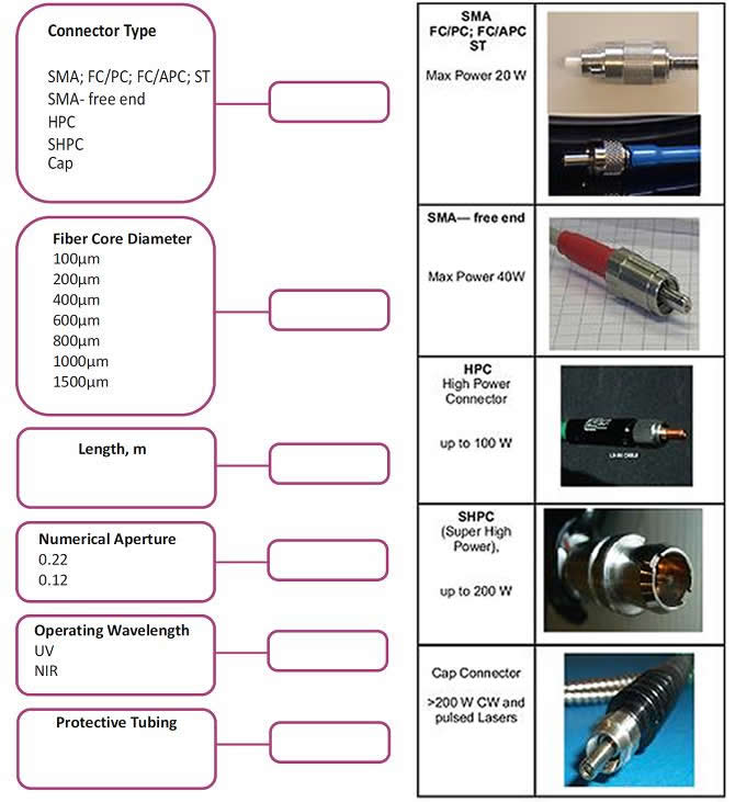 在订购光纤组件时需要考虑的最重要的一个因素就是确认哪一种类型的光纤适合你的应用,例如你选择的光纤的适用的波长范围是否能匹配你的应用。另外一个非常重要的参数就是光纤芯径。小芯径的光纤可以得到较好的光束质量和较好的柔韧性。