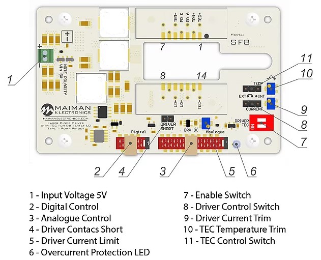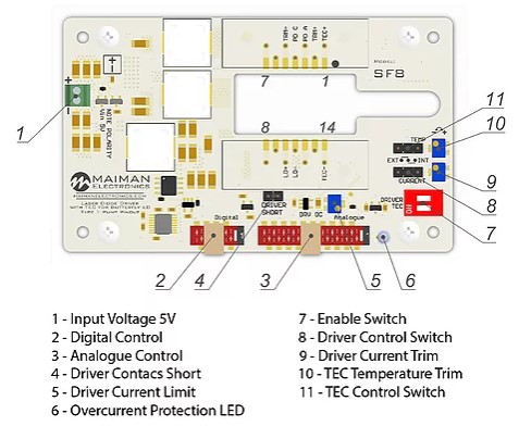电源 | 安装 | TEC 控制器 | 触发发生器 | 电位器 | 偏压电流 0-200mA | 激光二极管 | |