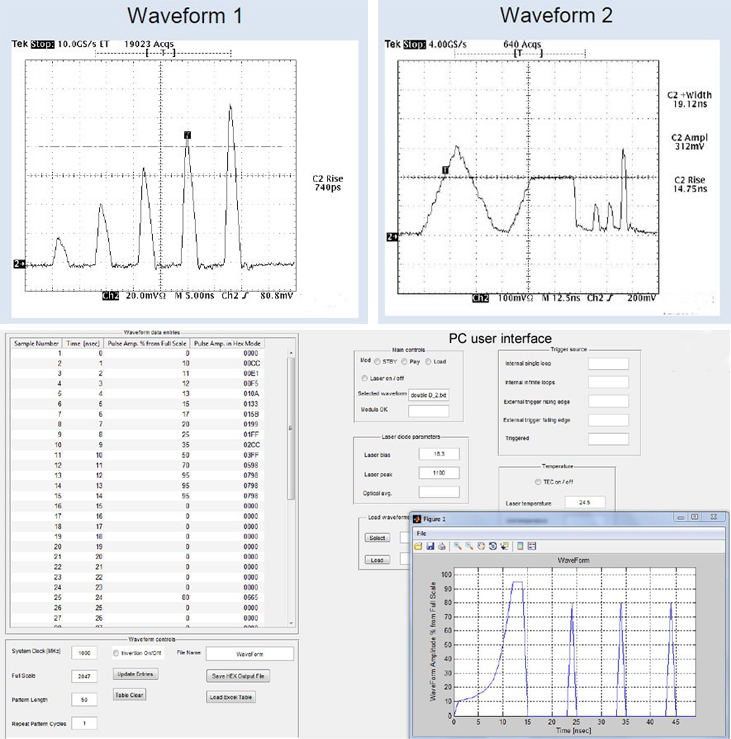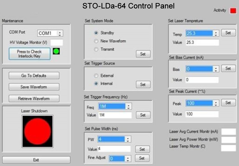 GUI软件可控制STO-LD模块的所有功能,并能显示其状态和监控数据。包括几十个预先设定的脉冲宽度、频率、偏置电流、峰值电流和LD温度。GUI还允许用户保存和检索波形。特别的安全功能:联锁输入、按键输入和GUI的一触式快速关闭。将控制器连接到STO-LD板集成了一个尺寸约为7X10 cm的板。用户也可以使用电缆连接这两块板。这两块板也可以连接成尺寸为70mm x 60mm的夹层。